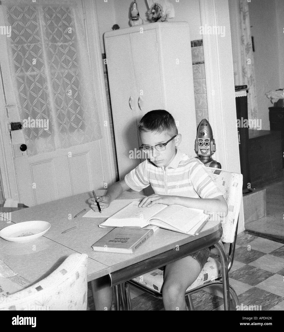 Young Boy Sits At Kitchen Table Doing Homework In The 1960 S Stock